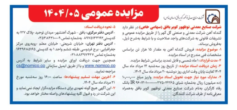شرکت صنایع معدنی نوظهور کویر بافق (سهامی خاص) در نظر دارد بخشی از محصول سنگ آهن دانه بندی خود از طریق مزایده عمومی و تشریفات
