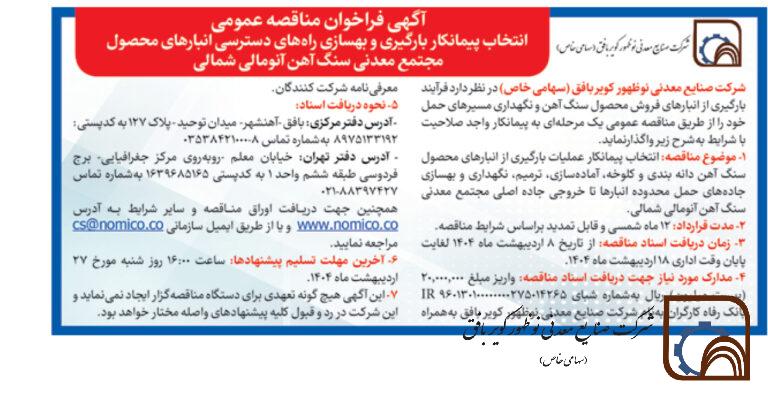 *** تاریخ تحویل اسناد تا پایان وقت اداری 1402/11/16 تمدید شده است *** شرکت صنایع معدنی نوظهور کویر بافق (سهامی خاص) در نظر دارد