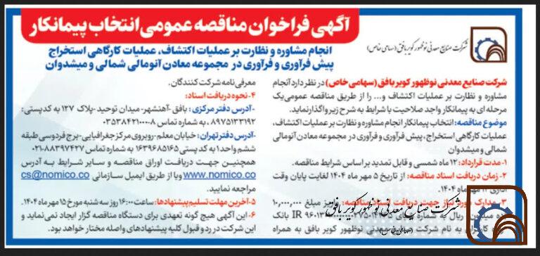شرکت صنایع معدنی نوظهور کویر بافق (سهامی خاص) در نظر دارد آنجام مشاوره و نظارت بر عملیات اکتشاف و… را از طریق مناقصه عمومی یک