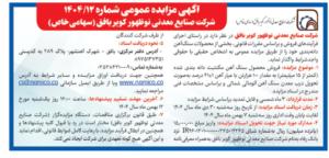 آگهی مزایده عمومی شماره 1404/12 شرکت صنایع معدنی نوظهور کویر بافق ( سهامی خاص)