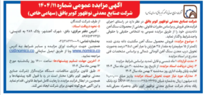 آگهی مزایده عمومی شماره 1404/11 شرکت صنایع معدنی نوظهور کویر بافق (سهامی خاص)