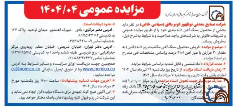 شرکت صنایع معدنی نوظهور کویر بافق (سهامی خاص) در نظر دارد بخشی از محصول سنگ آهن دانه بندی خود از طریق مزایده عمومی و تشریفات