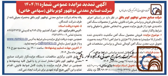 آگهی تمدید مزایده عمومی شماره 1404/11 شرکت صنایع معدنی نوظهور کویر بافق (سهامی خاص)
