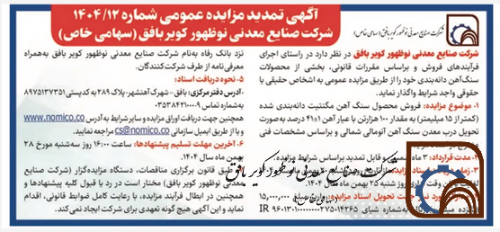 آگهی تمدید مزایده عمومی شماره 1404/12 شرکت صنایع معدنی نوظهور کویر بافق ( سهامی خاص)