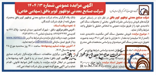 آگهی مزایده عمومی شماره 1404/13 شرکت صنایع معدنی نوظهور کویر بافق (سهامی خاص)