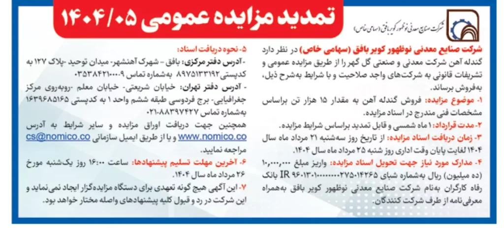 شرکت صنایع معدنی نوظهور کویر بافق (سهامی خاص) در نظر دارد گندله آهن شرکت معدنی و صنعتی گل گهر را از طریق مزایده عمومی و تشریفات قانونی به شرکت های واجد صلاحیت و با شرایط به شرح ذیل، به فروش برساند.