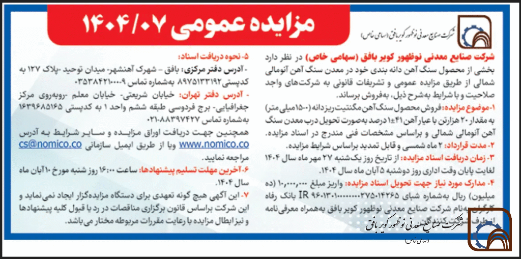 همچنین جهت دریافت اوراق مزایده و سایر شرایط به آدرس www.nomico.co ویا از طریق ایمیل سازمانی cs@nomico.co  مراجعه نمایید.