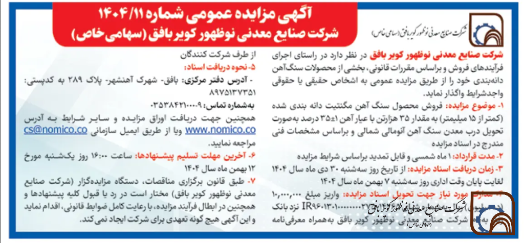 آگهی مزایده عمومی شماره 1404/11 شرکت صنایع معدنی نوظهور کویر بافق (سهامی خاص)
