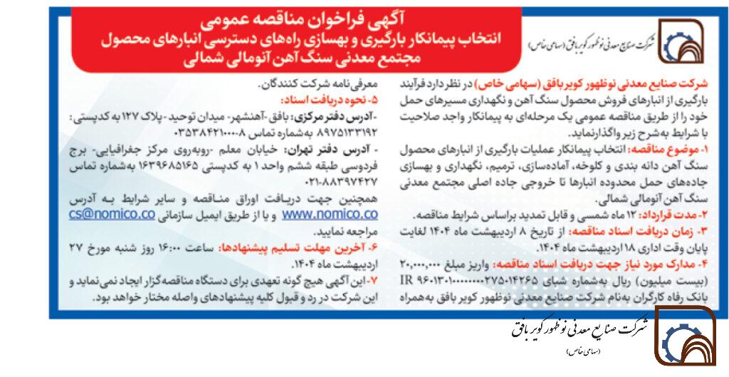 شرکت صنایع معدنی نوظهور کویر بافق (سهامی خاص) در نظر دارد فرایند بارگیری از انبارهای فروش محصول سنگ آهن و نگهداری مسیرهای حمل خود را از طریق مناقصه عمومی یک مرحله ای به پیمانکار واجد صلاحیت با شرایط به شرح زیر واگذارنماید. – آدرس دفتر مرکزی : بافق -آهنشهر- میدان توحید -پلاک 127 به کدپستی: […]
